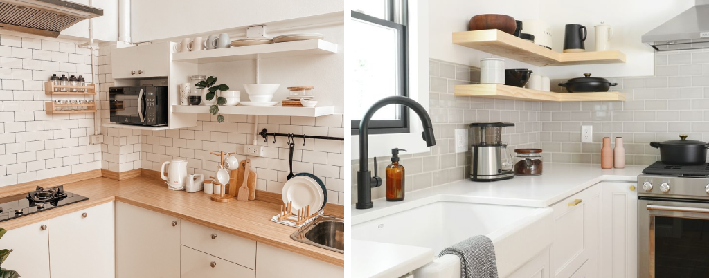 - Usa repisas abiertas en lugar de muebles cerrados, siempre y cuando mantengas todo organizado.