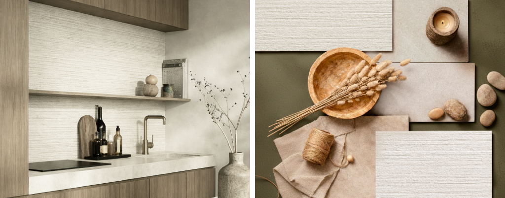 3. La textura a través de las terminaciones: la textura no solo es volumen físico; también es cómo la luz interactúa con el material. Alternar entre acabados es una forma sutil y elegante de texturizar. Con colecciones como Moonstone, puedes jugar con el contraste entre terminaciones mate y lappato (semi-pulido), logrando un dinamismo visual sin salir de tu paleta base.