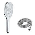 • Ducha manual con botón para 3 funciones con manguera flexible.