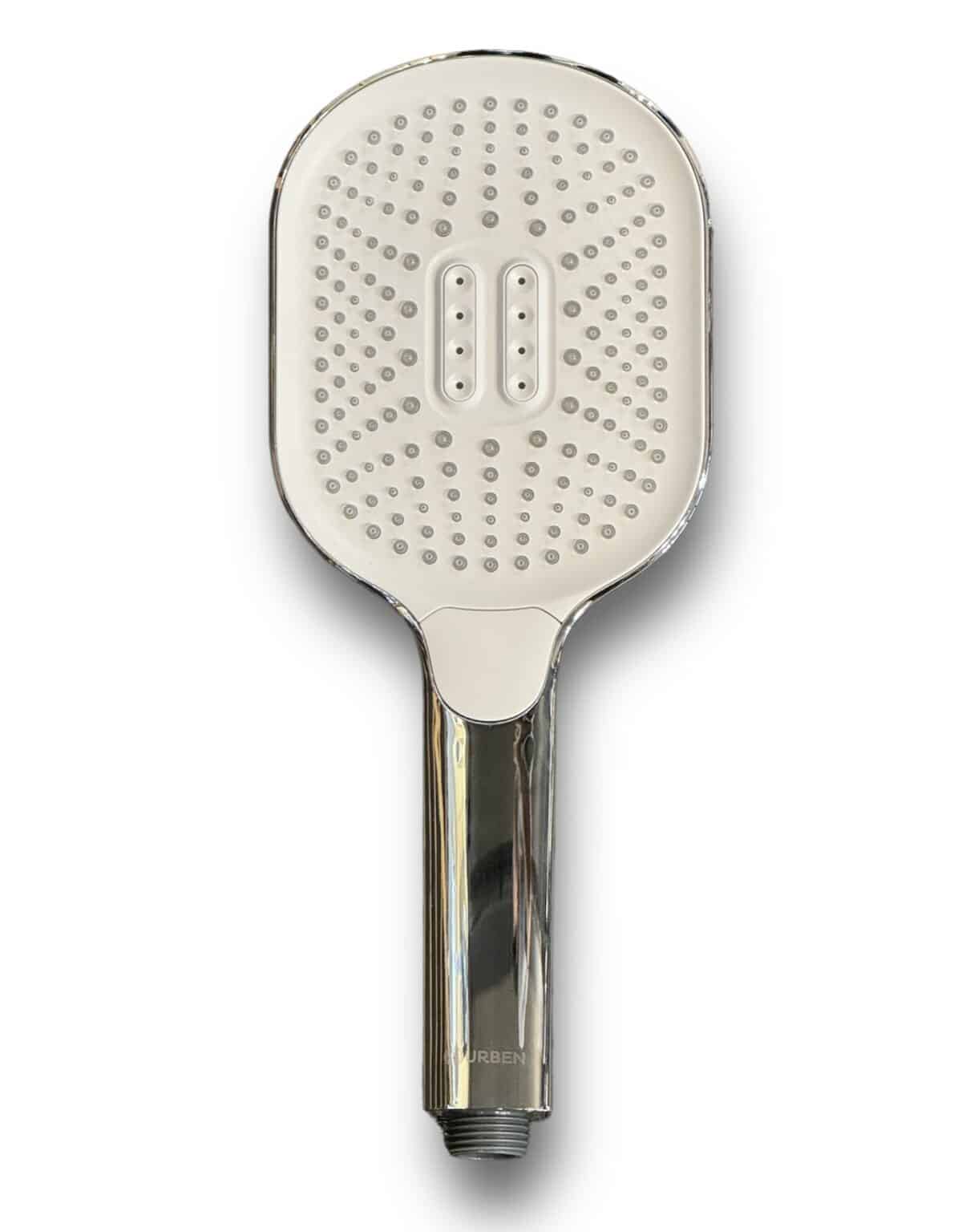 Esta ducha manual tiene un look moderno y viene con un botón que te permite elegir 3 opciones de chorros de agua, donde el aire se presuriza y cada gota de agua se inyecta con energía de aire con mayor fuerza convirtiendo tu ducha en un SPA. Fabricada en ABS, lo cual la hace más ligera que los materiales tradicionales. Su acabado es cromado Star Shine y el respaldo de la marca URBEN asegura que sea de alta calidad y duradera.