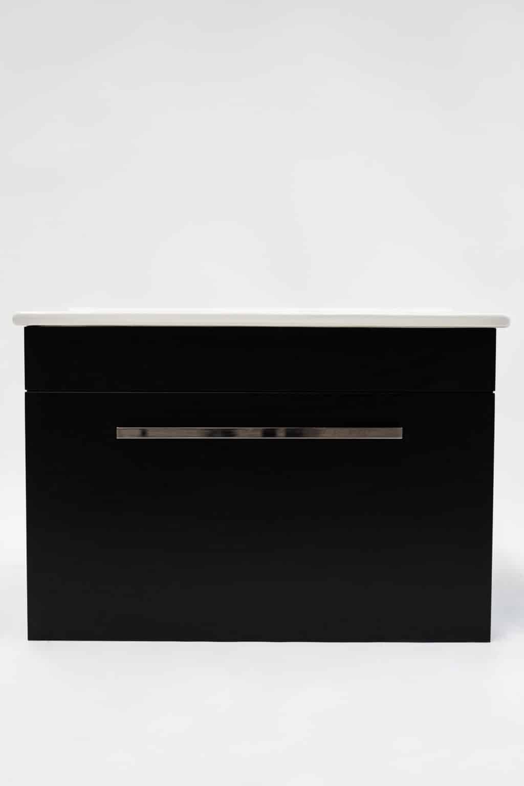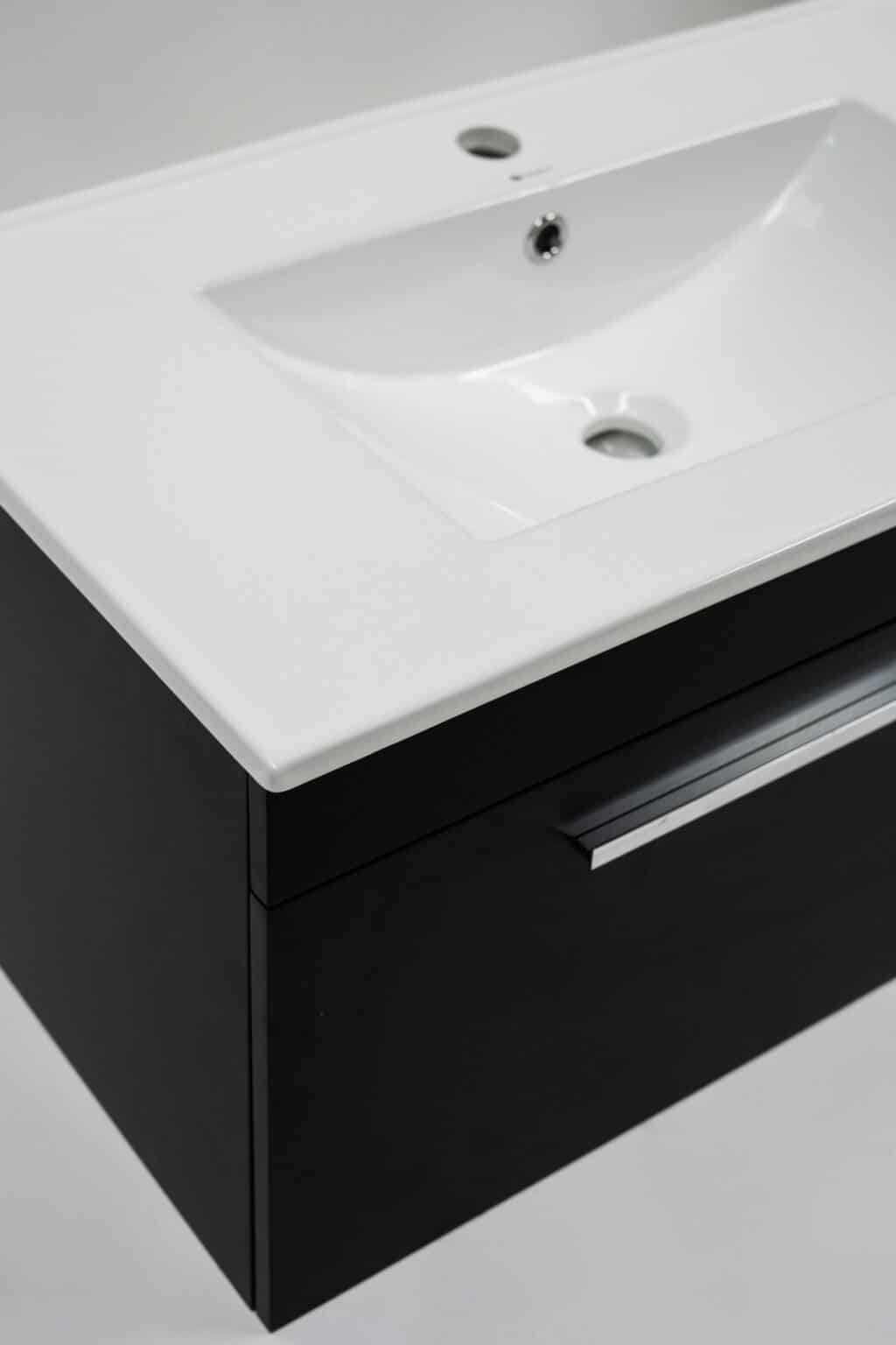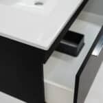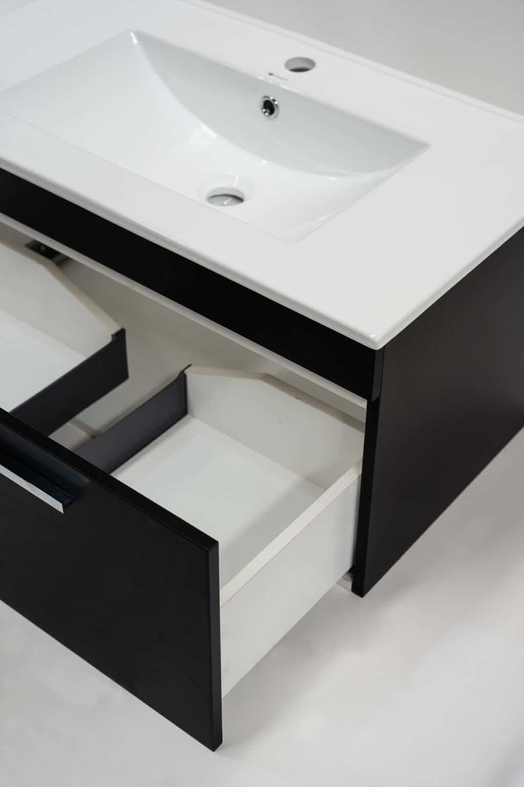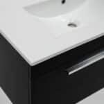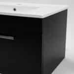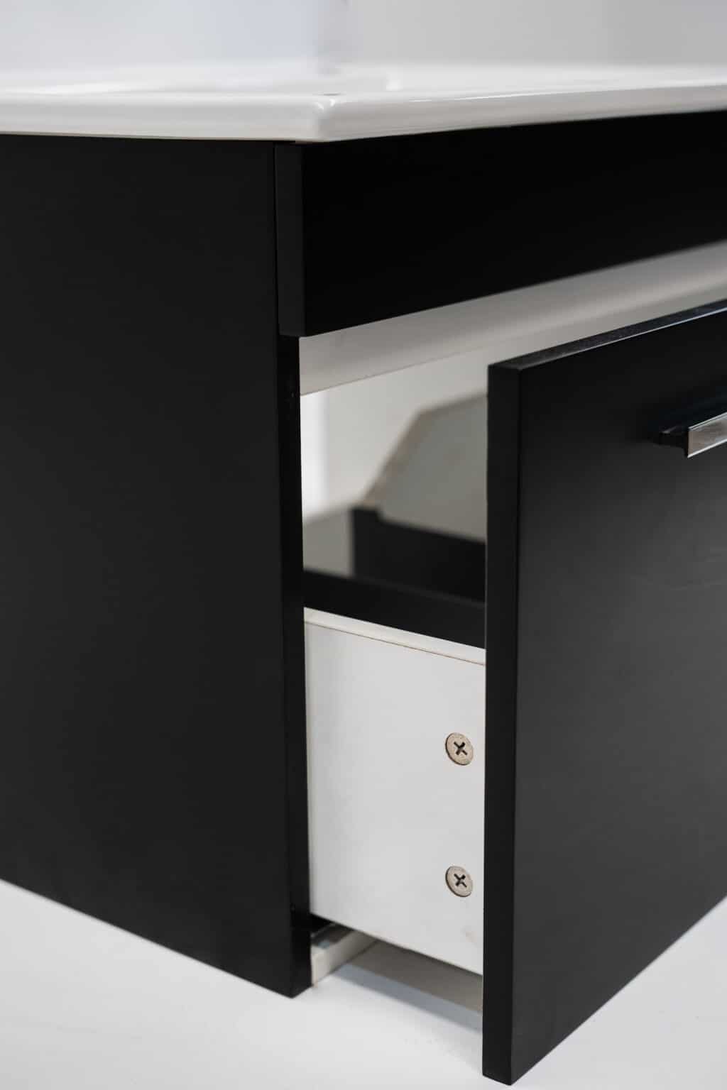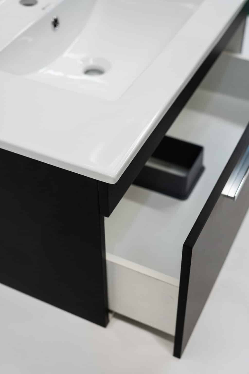 La medida de este mueble es de 590x450x400mm y viene en colores: Blanco, Gris o Negro todos con terminación Mate. También disponible en medidas de 790 mm de ancho. Este mueble incluye lavamanos y es para ser instalado a muro con una carga máxima aproximada de 30 kilos. Su cajón viene con sistema de cierre lento.