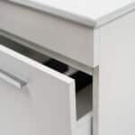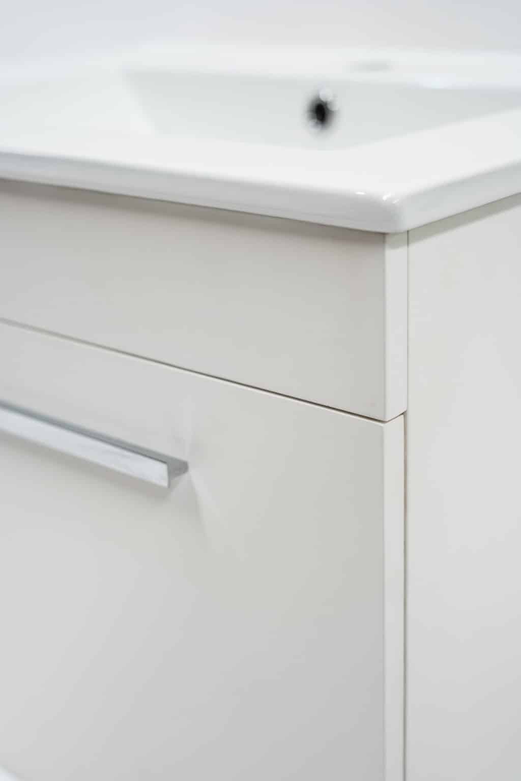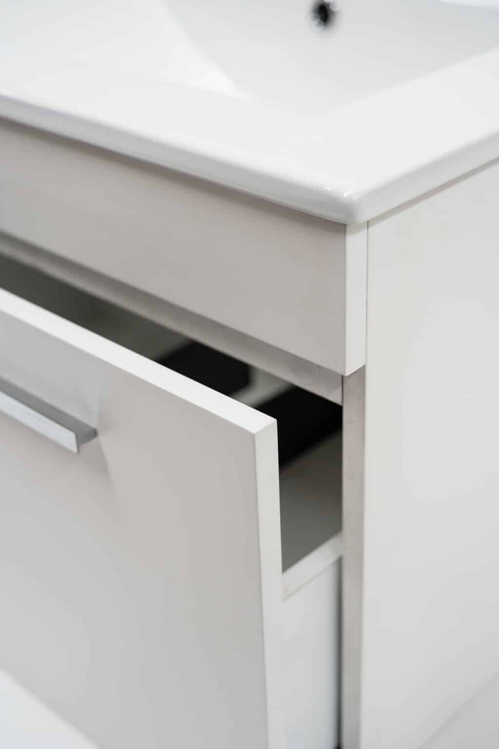 La medida de este mueble es de 790x450x400mm y viene en colores: Blanco, Gris o Negro todos con terminación Mate. También disponible en medidas de 590 mm de ancho. Este mueble incluye lavamanos y es para ser instalado a muro con una carga máxima aproximada de 30 kilos. Su cajón viene con sistema de cierre lento.