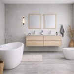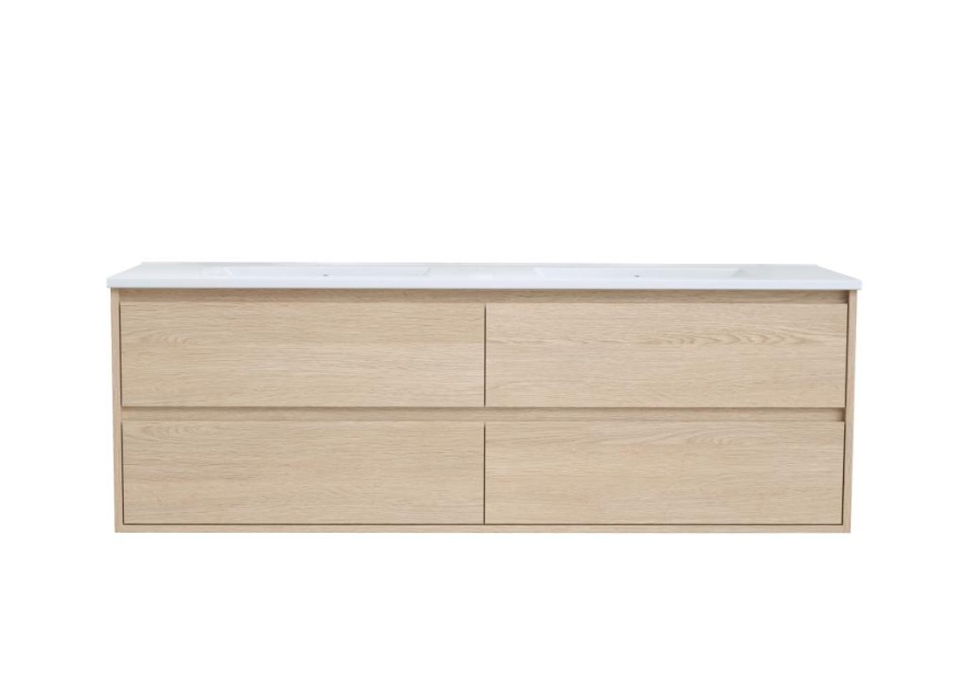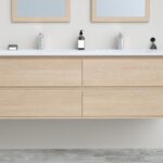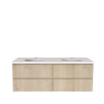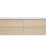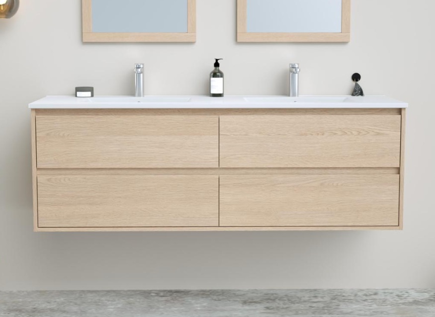 Mueble para vanitorio suspendido con cubierta para 2 lavamanos y 4 cajones con cierre lento, resaltando su durabilidad, resistencia a manchas y su aspecto sofisticado, ideal para darle un toque de lujo a cualquier baño