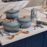 Olla Ovalada 28 cm Dark Blue + Lavaplatos Cerámica Tipo Granja Ingalls White + Grifería de Cocina a Muro Plegable Kai para Llenado de Ollas + Plancha de Cuarzo Navy Noir Pulido 3220x1620x20mm