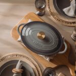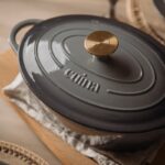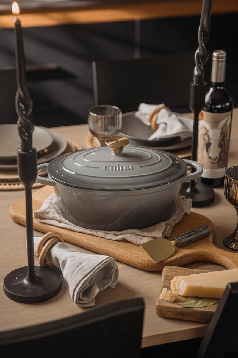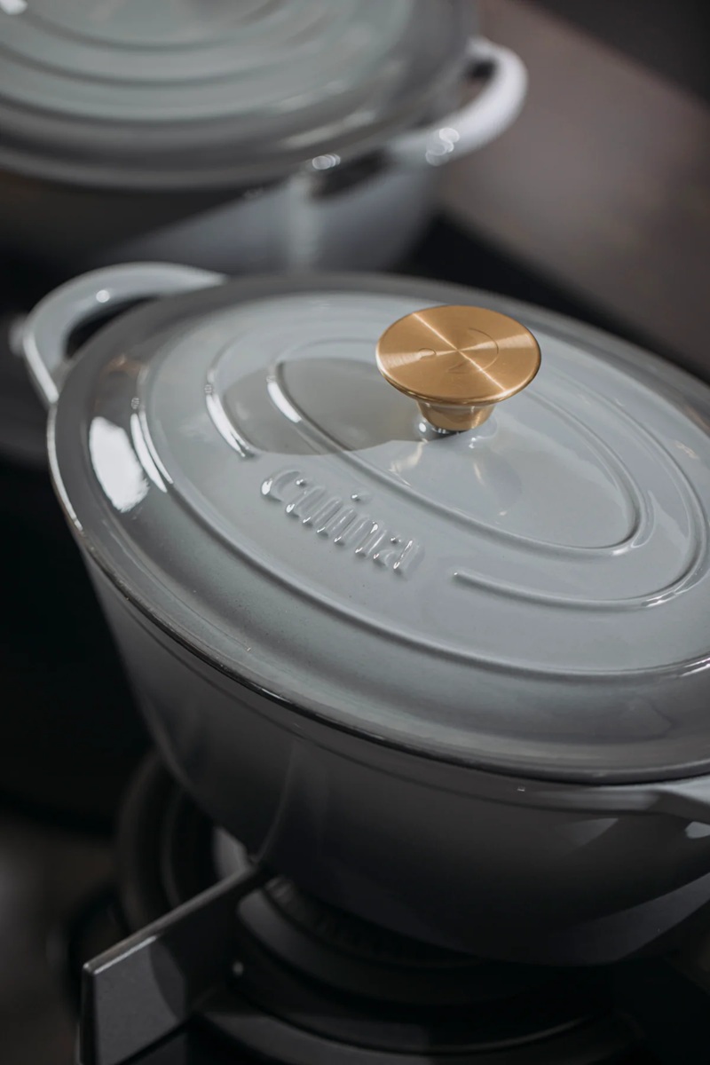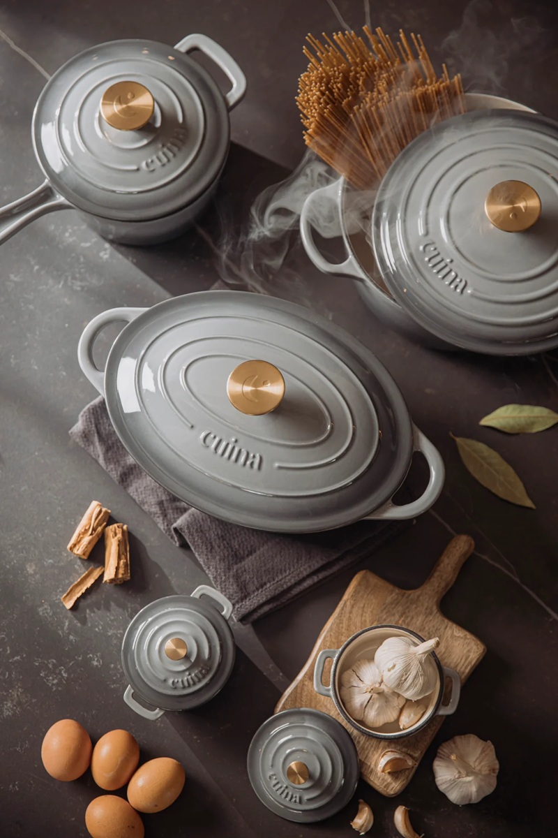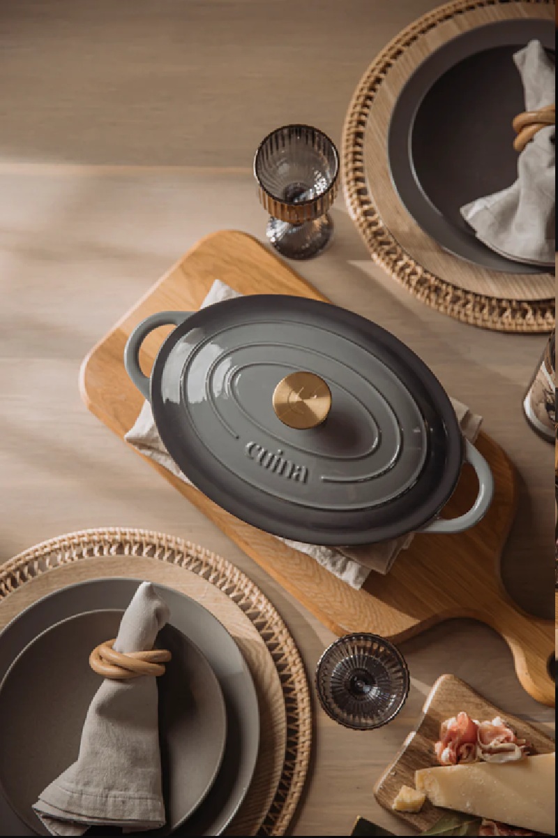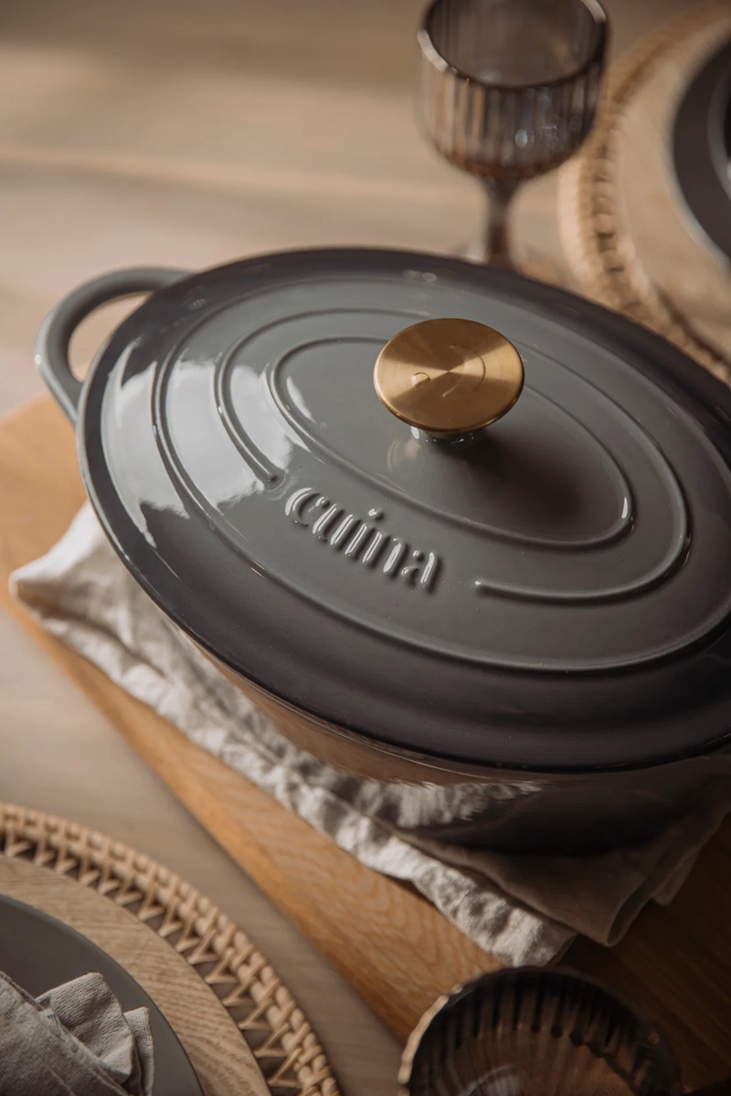 La Olla ovalada de 28 cm en color Grey, ideal para asados, guisos y recetas familiares. Hierro fundido esmaltado que distribuye el calor de manera uniforme para una cocción perfecta.