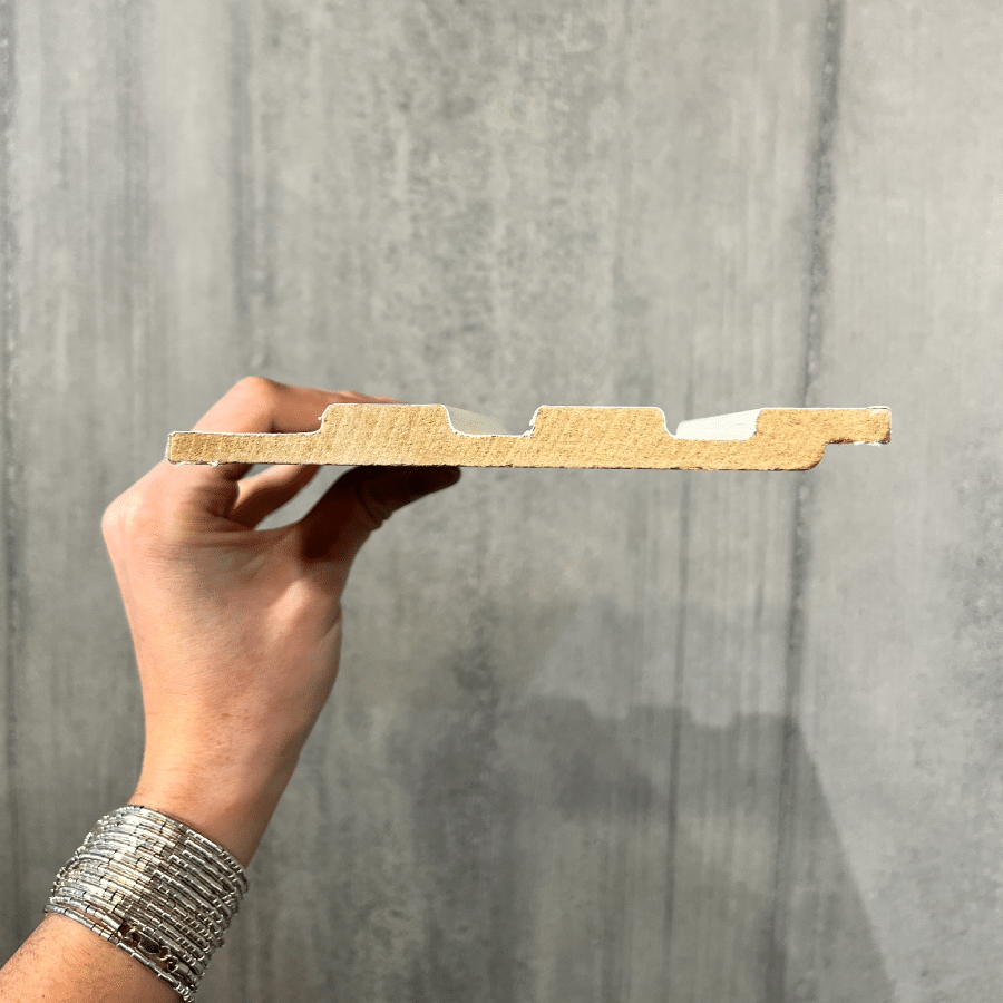 Material a base de tableros de MDF de alta calidad de 650 KG/m³. Recubierto con papel folio fotolaminado de alta resistencia al desgaste del tipo FX120